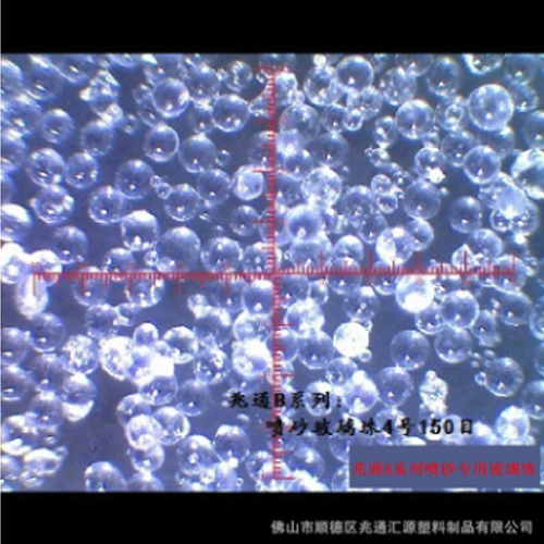 圖中有顯微放大讀數(shù),表面看是白色粉末狀,40倍放大顯現(xiàn)透明玻璃珠形狀。色澤判斷質(zhì)量,越白越優(yōu)質(zhì)。反之,越暗噴砂出來的產(chǎn)品也越暗。