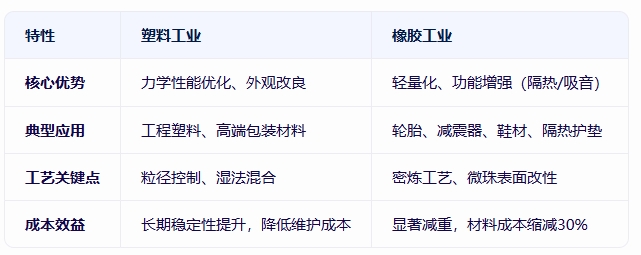 在塑料與橡膠工業(yè)領(lǐng)域,玻璃珠(尤其是空心玻璃微珠)作為彈性體改性材料,其應(yīng)用特點(diǎn)可歸納為以下核心優(yōu)勢(shì)與分析: